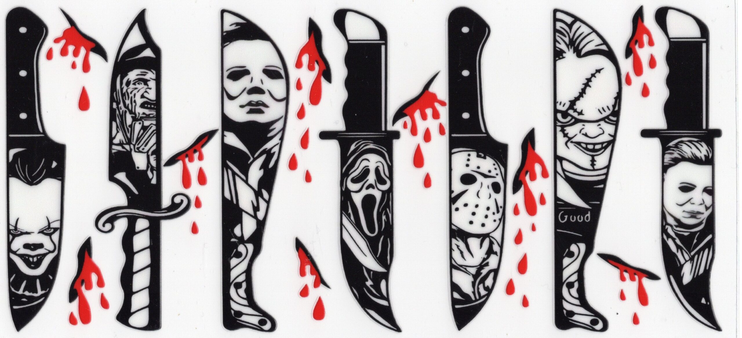 Our Horror Movie Knives UV DTF wrap is a chilling must-have for any horror fan. Featuring an array of detailed knives, each blade reflecting the face of an iconic horror movie character, this design delivers a bold and eerie aesthetic. The crisp, high-definition print captures every sinister expression and sharp edge, making it perfect for creating standout tumblers, mugs, and other smooth-surface items. Produced with premium UV DTF printing, it’s durable, scratch-resistant, and fade-proof, ensuring your design stays hauntingly vivid. Easy to apply, this wrap adds a spine-tingling, cinematic touch to your crafts—ideal for Halloween, horror-themed gifts, or year-round fright…